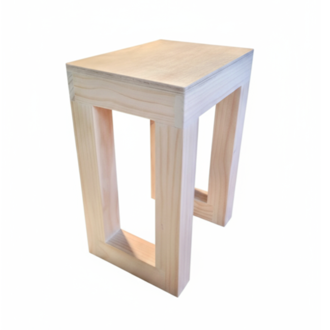 The Mid Stool seamlessly integrates into the collection with its streamlined pine frame and sturdy marine-grade plywood top showcase the same blend of simplicity and bold geometry found throughout the collection. This results in a multifunctional piece that balances enduring style with practical use, serving not only as a comfortable seat but also as a bedside table, plant stand, or convenient workspace stool.